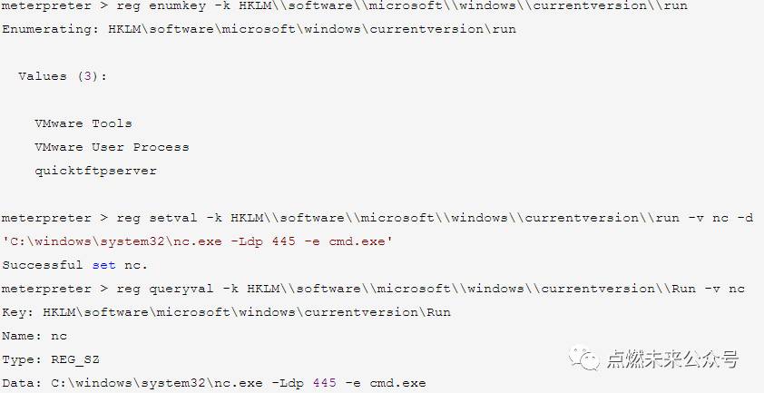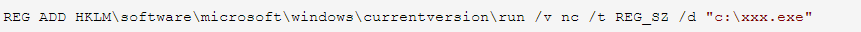 Afterwards, we work with the registry to have netcat execute on start up and listen on port 445. We do this by editing the key ‘HKLM\software\microsoft\windows\currentversion\run’.