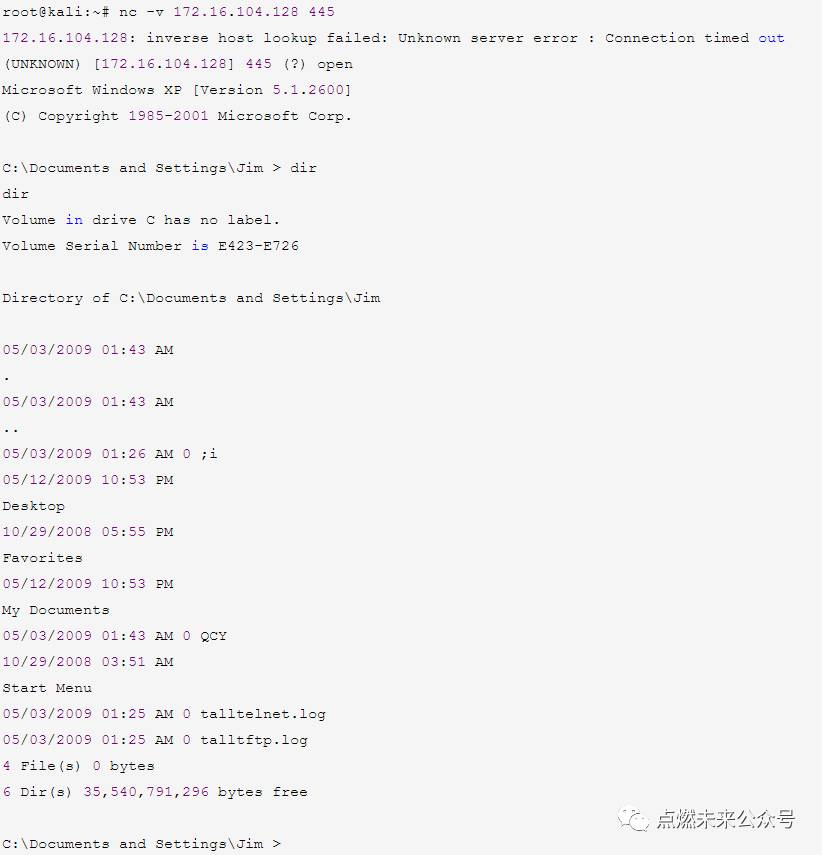 In this example, instead of looking up information on the remote system, we will be installing a netcat backdoor. This includes changes to the system registry and firewall.